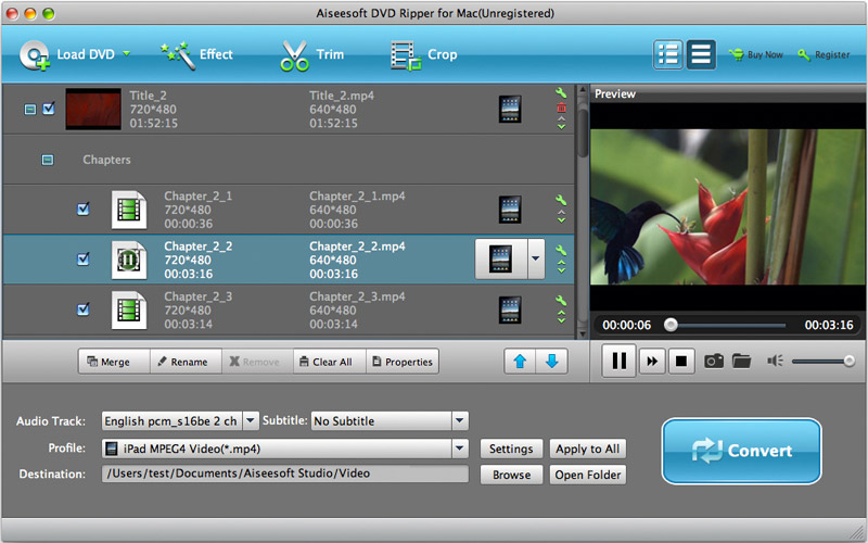 It allows you to merge and convert selected titles or chapters into one file. You can choose to rip DVD on MAC with entire movie or just one or several chapters at will or just choose to convert a segment of the DVD movie by selecting the beginning point.