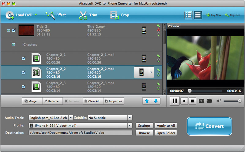 DVD to iPhone for Mac allows you to merge and convert all the titles or chapters you want to convert into one file.